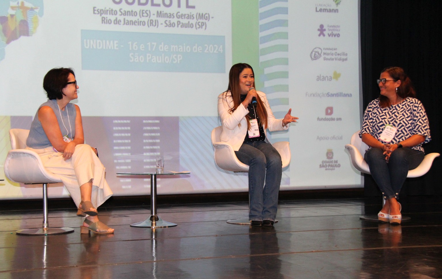 Os desafios enfrentados pelas adolescências e juventudes no contexto educacional foram abordados na mesa que encerrou a programação do Fórum Regional Sudeste. Tereza Farias, coordenadora-geral de Ensino Fundamental do MEC, e Patrícia Mota Guedes, superintendente do Itaú Social, lideraram uma discussão esclarecedora sobre as dificuldades enfrentadas por estudantes e educadores nessa etapa de ensino, que requerem um olhar e políticas públicas específicas. A mesa-redonda foi conduzida pela professora Mariane Pimenta, Dirigente Municipal de Educação de Três Pontas/MG.