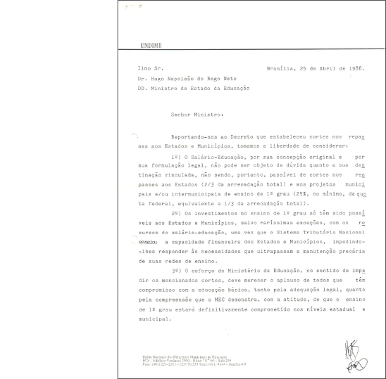 A Undime parabeniza o Ministro Hugo Napoleão pelo esforço do MEC em se posicionar contra os cortes nos recursos do salário-educação, ressaltando ser uma das poucas fontes para a manutenção das redes de ensino.