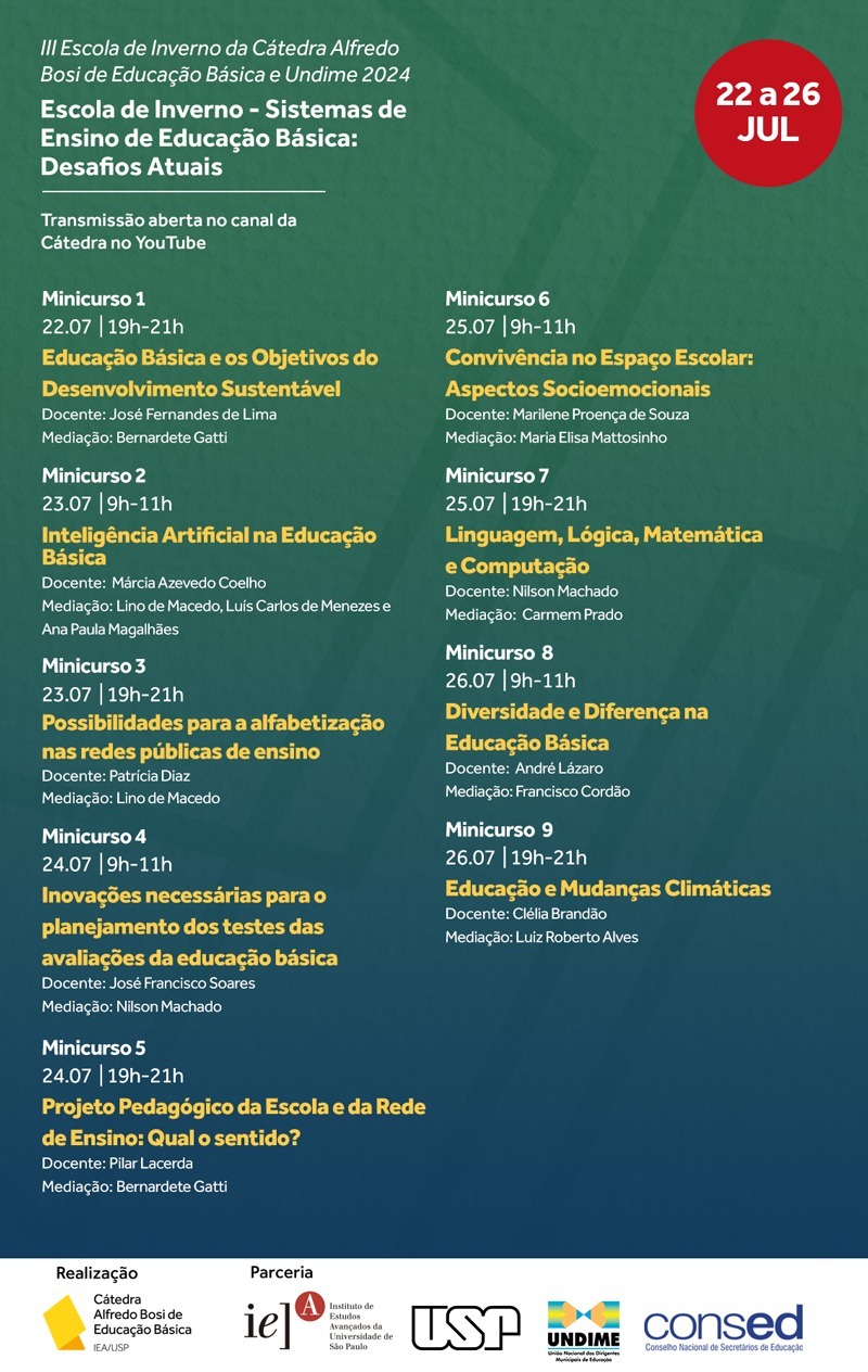 A Cátedra Alfredo Bosi de Educação Básica, da Universidade de São Paulo (USP), organiza a 3ª edição da Escola de Inverno que, este ano, traz o tema “Sistemas de Ensino de Educação Básica: desafios atuais“. Os minicursos serão realizados todos os dias, de 22 a 26 de julho, com foco em gestores e professores da educação básica. No decorrer das atividades, o público terá a oportunidade de discutir os desafios que impactam as escolas atualmente.