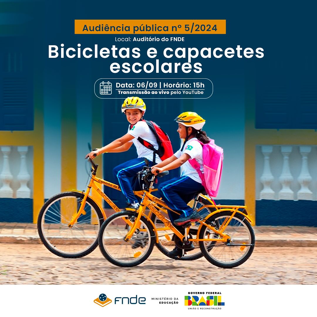 O Fundo Nacional de Desenvolvimento da Educação (FNDE), autarquia federal vinculada ao Ministério da Educação (MEC), realizará nesta semana a Audiência Pública nº 05/2024, com o intuito de reunir subsídios para o planejamento da contratação de bicicletas e capacetes escolares destinados a estudantes da educação básica das redes públicas de ensino em todo o Brasil. O evento ocorre na sexta-feira, 6 de setembro, a partir das 15h, no auditório do FNDE, em Brasília (DF).