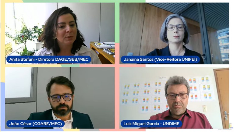 Também participaram do webinário o coordenador-geral de Apoio às Redes de Ensino do MEC, João César; a vice-reitora da Universidade Federal de Itajubá, Janaína Santos; e o presidente da União Nacional dos Dirigentes Municipais de Educação (Undime), Luiz Miguel Martins.