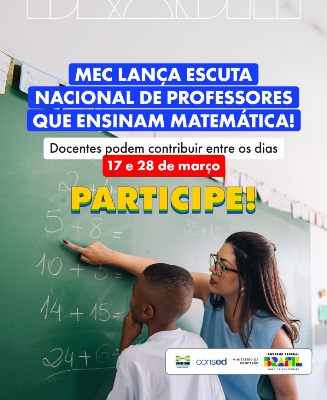 O Ministério da Educação (MEC) iniciou, nesta segunda-feira, 17 de março, a Escuta Nacional de Professores e Professoras que Ensinam Matemática para profissionais dos ensinos fundamental e médio da educação básica e da educação profissional e tecnológica (EPT). A pesquisa, coordenada por meio da Secretaria de Educação Básica (SEB), coletará contribuições de docentes a fim de orientar e a definir ações e estratégias para melhoria da aprendizagem nessa área de conhecimento, com base nas necessidades e nas demandas apontadas pelos professores. A ação seguirá até o dia 28 de março.