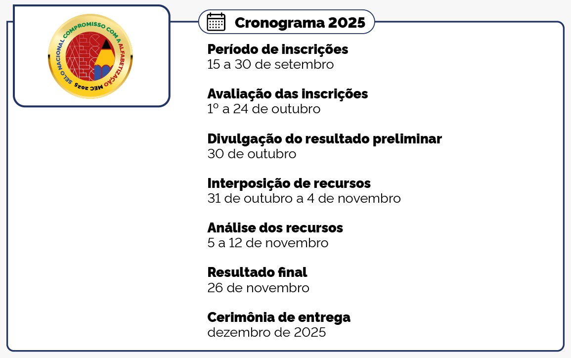 O Ministério da Educação (MEC) publicou, nesta segunda-feira, 25 de agosto, o Edital MEC nº 10/2025, que torna pública a 2ª Edição do Selo Nacional Compromisso com a Alfabetização. A iniciativa faz parte do Compromisso Nacional Criança Alfabetizada (CNCA) e busca reconhecer os esforços de estados, municípios e do Distrito Federal para a promoção da alfabetização na idade certa.