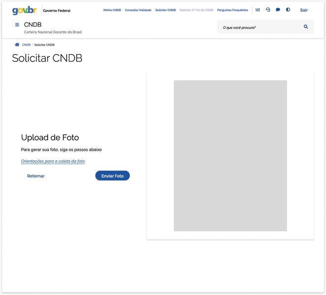 4. A tela seguinte é para envio da foto que será utilizada na carteira. O professor deve verificar os parâmetros de upload exigidos, disponíveis no link “Orientações para a coleta da foto”, selecionar a imagem e apertar o botão “Enviar foto”.