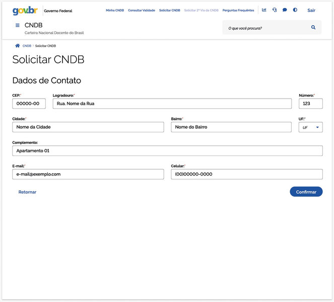3. Após confirmar as informações, o professor deve informar os dados de contato, como endereço completo, e-mail e telefone. É importante ressaltar que todos os campos de preenchimento são obrigatórios. Em seguida, basta clicar em “Confirmar” para enviar as informações.