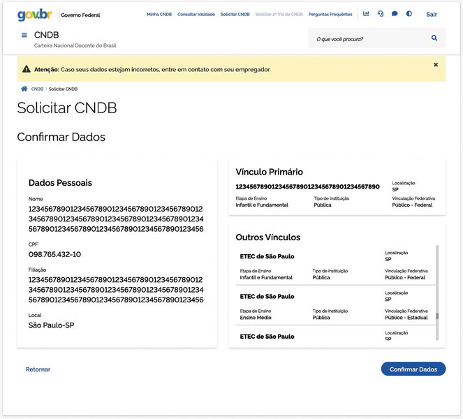 2. Caso atenda aos critérios, o sistema apresentará, automaticamente, os dados pessoais e informações como vínculos com instituições de ensino, filiação e estado. O professor deverá, então, verificar as informações. Caso estejam corretas, basta clicar no botão “Confirmar dados”. Em caso de erro, será preciso entrar em contato com a instituição empregadora para correção.