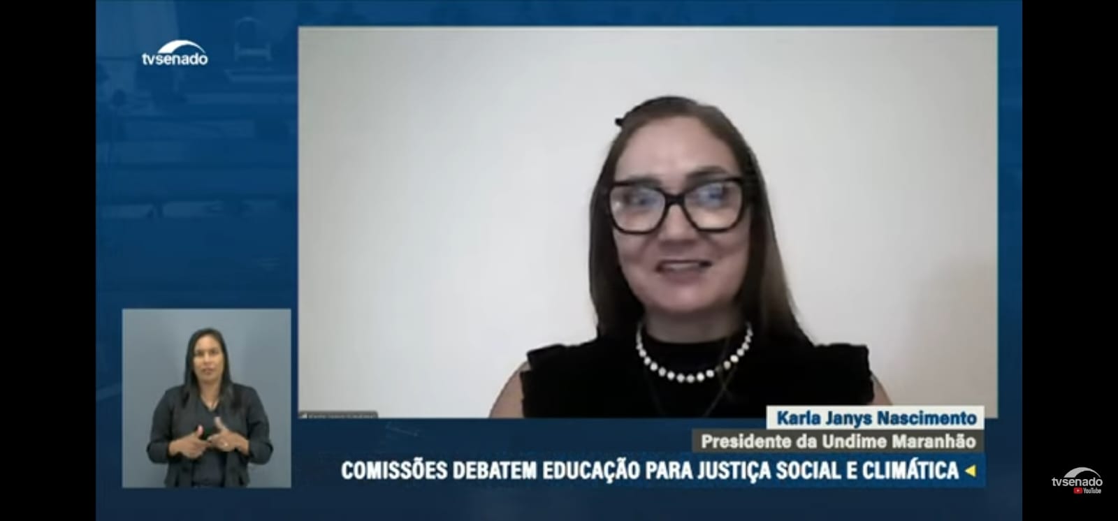 Nesta quarta-feira, 23 de abril, a Undime participou de uma audiência pública organizada conjuntamente pelas Comissões de Educação e Cultura e de Meio Ambiente do Senado Federal, com o objetivo de debater os desafios de uma educação comprometida com a justiça social e climática, a proteção da biodiversidade e o desenvolvimento socioambiental sustentável. A instituição foi representada por Karla Nascimento, Dirigente Municipal de Educação de Açailândia/MA e presidente da Undime Maranhão.