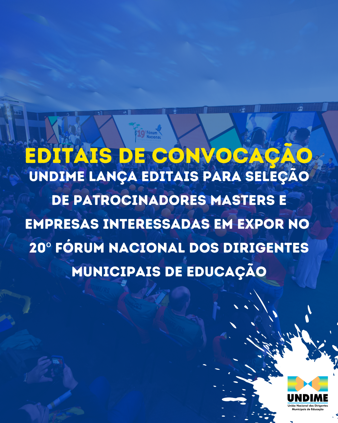 A União Nacional dos Dirigentes Municipais de Educação (Undime) torna público os editais para seleção de patrocinadores masters e de empresas expositoras para o 20º Fórum Nacional dos Dirigentes Municipais de Educação.