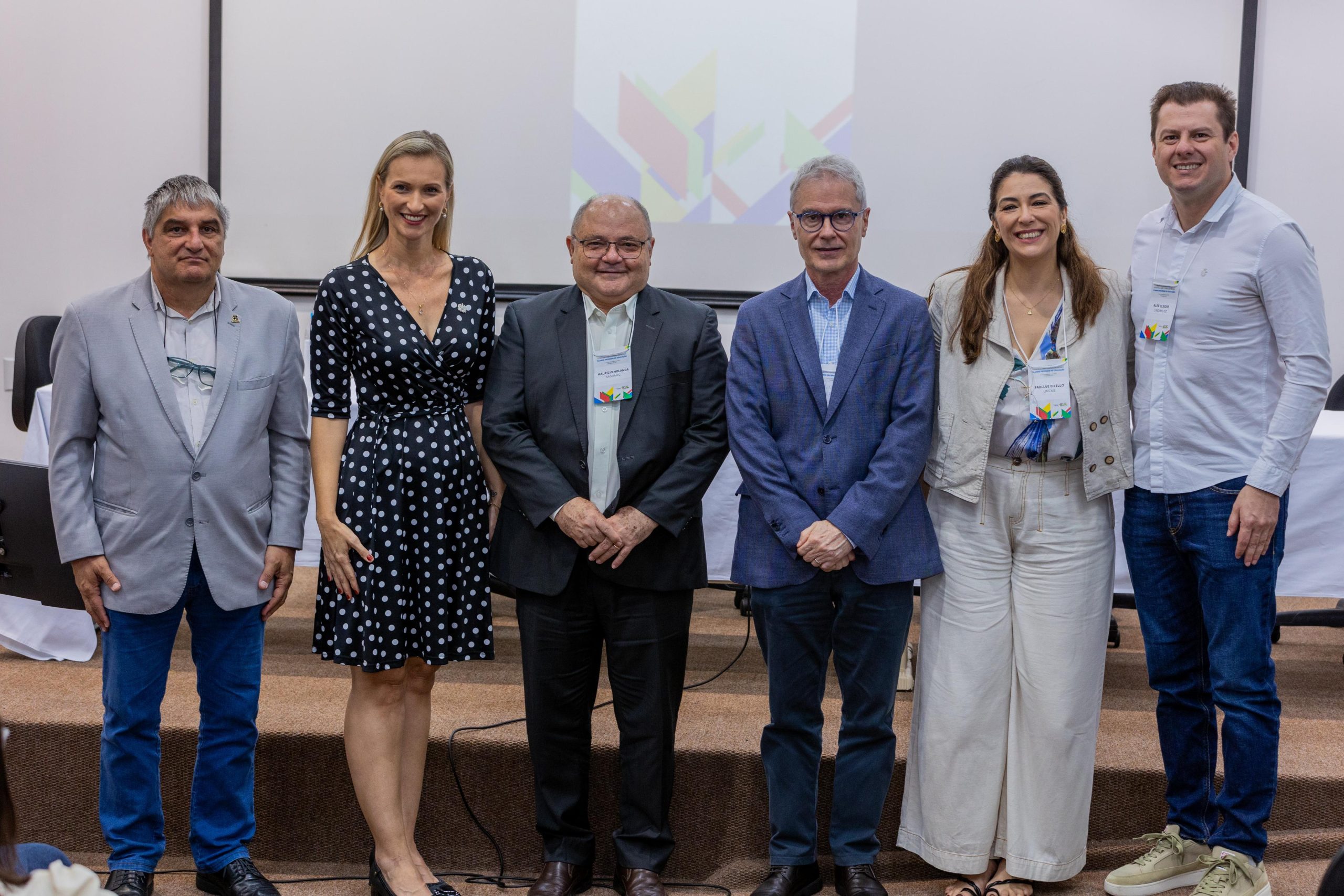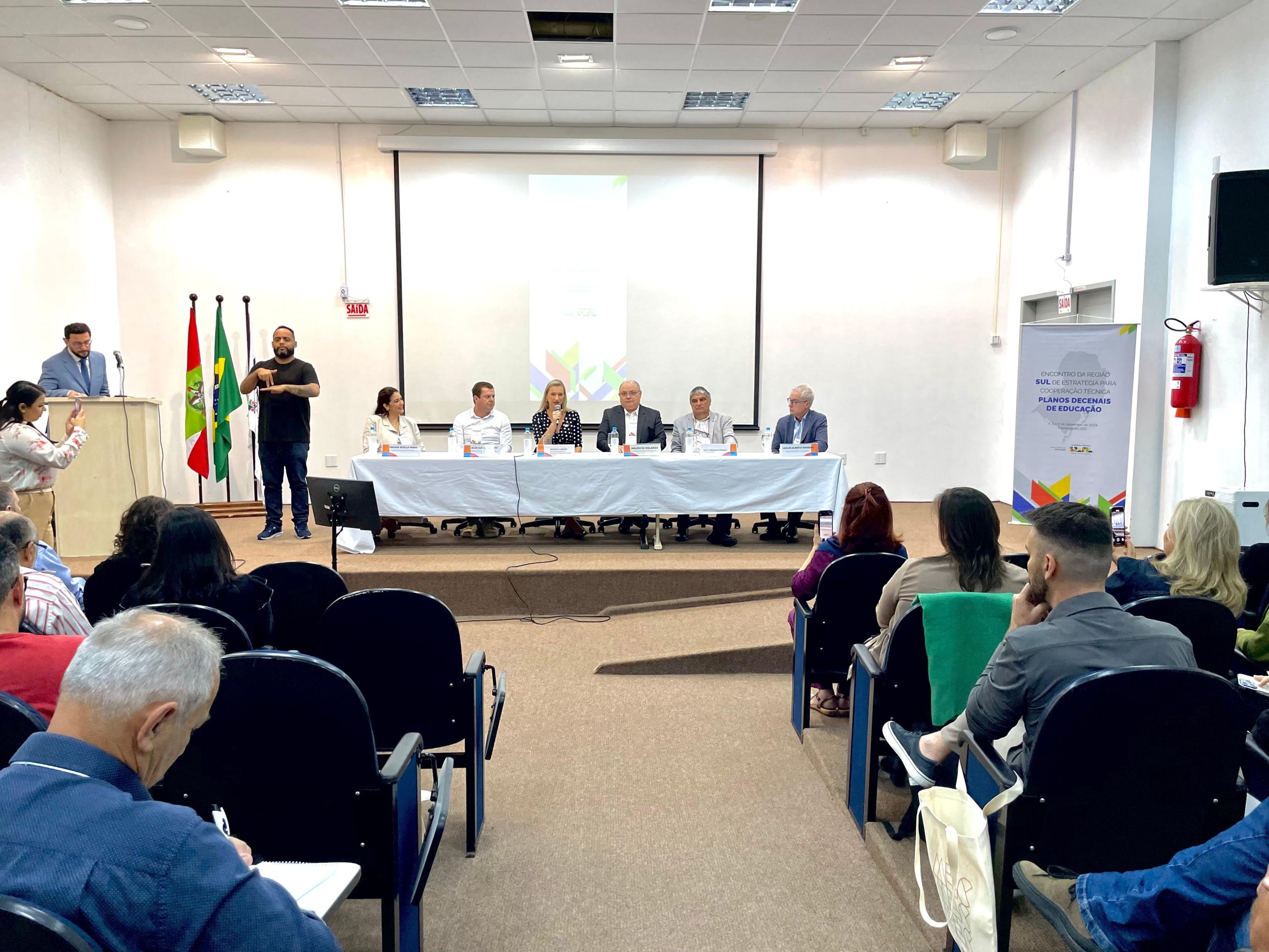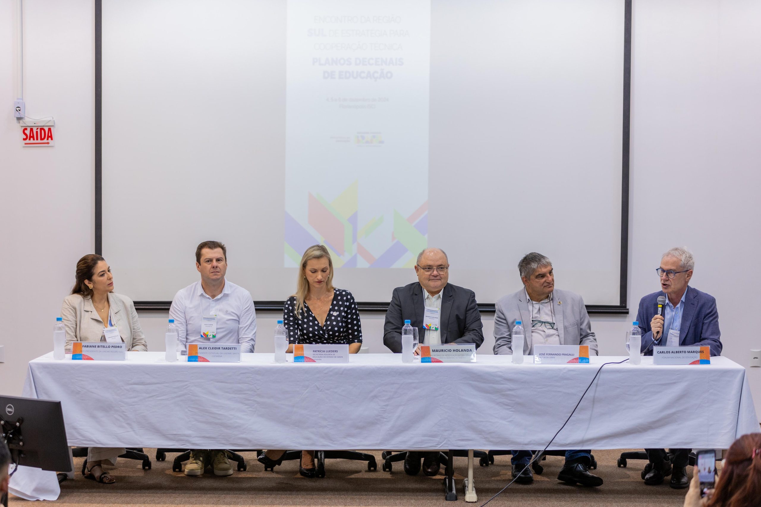 A mesa de abertura contou também com a presença do secretário da Sase, Maurício Holanda; da secretária-adjunta de Educação do estado de Santa Catarina, Patrícia Lueders; da vice-presidente da União Nacional dos Conselhos Municipais de Educação (Uncme) Região Sul, Fabiane Bitello; e do membro do Fórum Nacional de Educação (FNE), Carlos Alberto Marques.