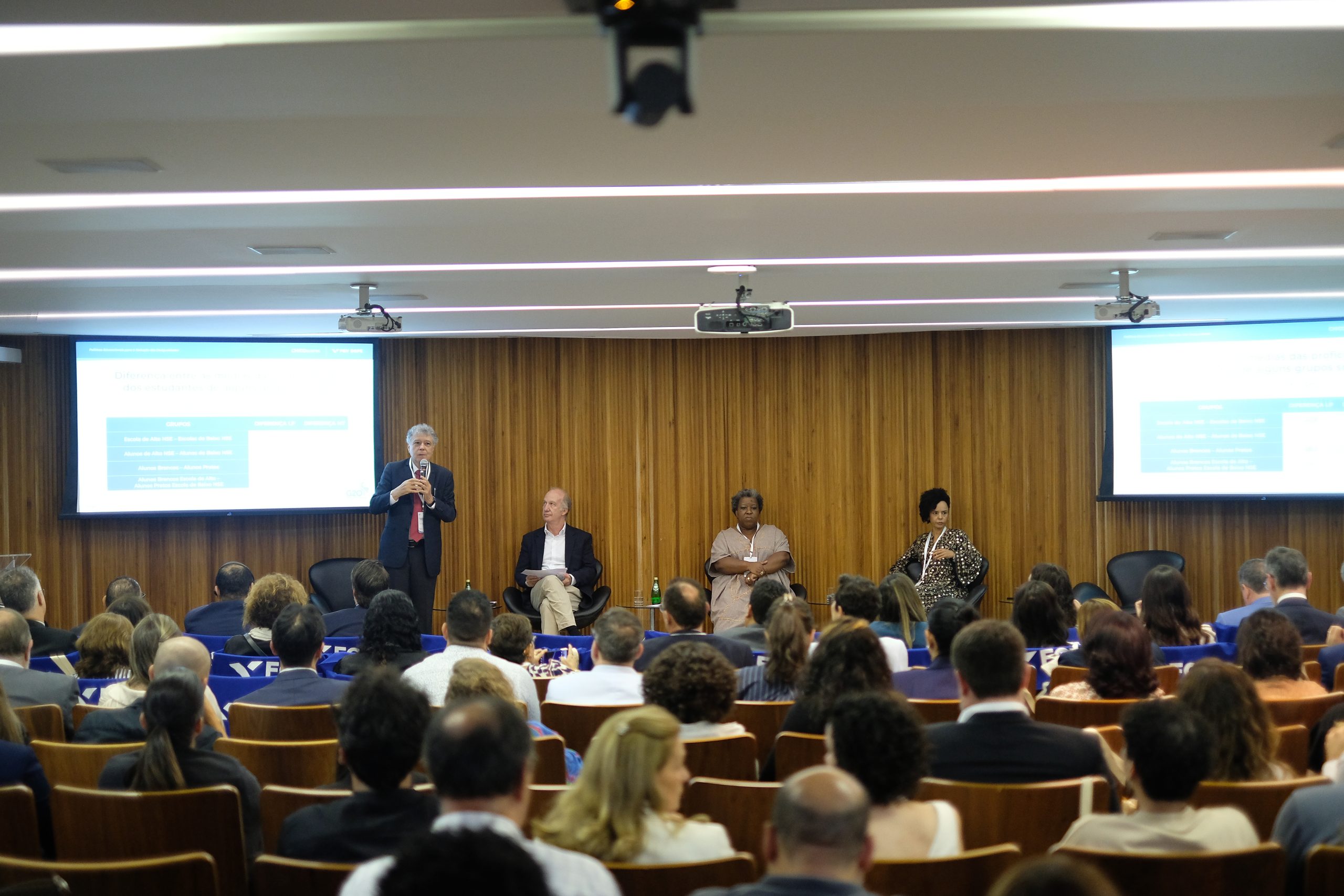 À tarde as atividades seguiram com o “Seminário Catalisando Mudanças: O papel da educação na construção de um futuro justo e sustentável, alinhado com as prioridades do Brasil no G20”, que contou com tradução simultânea Português/Inglês e painéis sobre financiamento inovador em educação, o papel das fundações no avanço do desenvolvimento sustentável e políticas educacionais para a redução de desigualdades. O evento reflete o compromisso do Brasil, sob a presidência do G20, em destacar a educação como peça central para um futuro mais justo e sustentável.