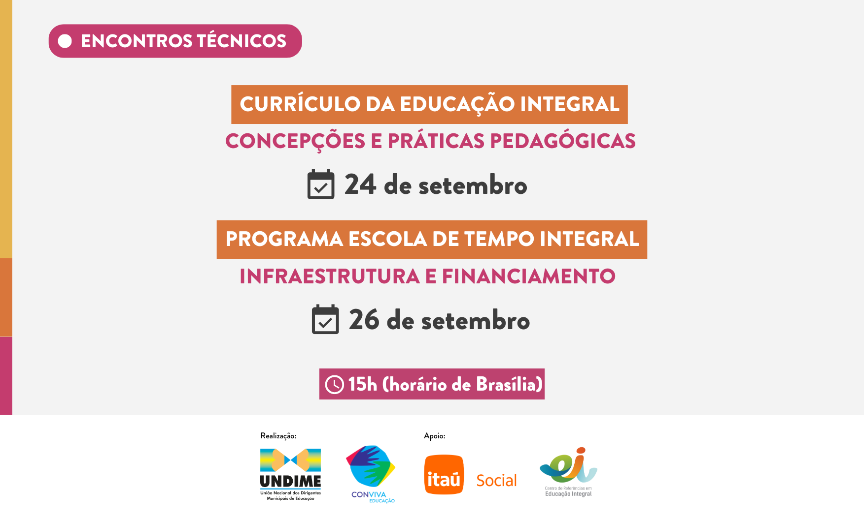 Pensando em apoiar os municípios no que diz respeito à política de Educação Integral em Tempo Integral, a Undime promoverá dois encontros técnicos, com transmissão ao vivo pelo Conviva Educação. A iniciativa conta com o apoio do Itaú Social e do Centro de Referências em Educação Integral.