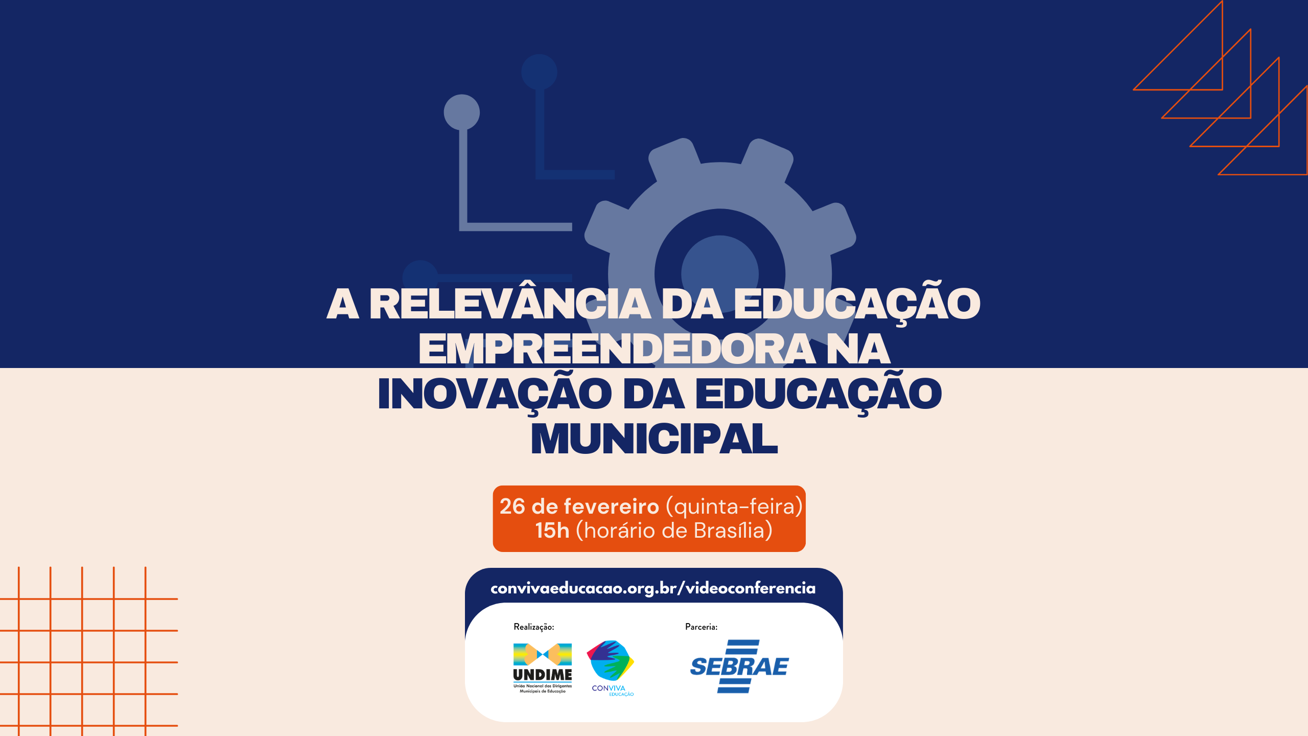 A Undime, por meio do Conviva Educação, em parceria com o Sebrae, realizará, no dia 26 de fevereiro (quinta-feira), às 15h (horário de Brasília), a videoconferência com o tema “A relevância da Educação Empreendedora na inovação da educação municipal”. O encontro tem como objetivo promover reflexões sobre o desenvolvimento do protagonismo, da criatividade, do pensamento crítico e de competências essenciais para o futuro no contexto das redes públicas municipais de ensino.
