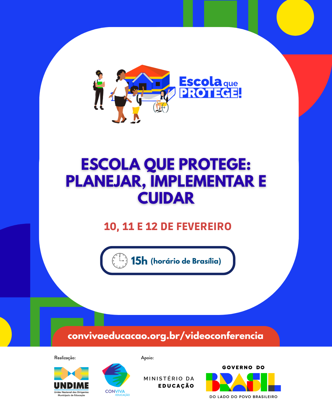 A Undime, em parceria com o Ministério da Educação (MEC), realizará a série de webinários “Escola que Protege: planejar, implementar e cuidar”. Serão três dias – 10, 11 e 12 de fevereiro – com transmissões ao vivo, às 15h (horário de Brasília), pelos canais do Conviva Educação e do MEC no YouTube.