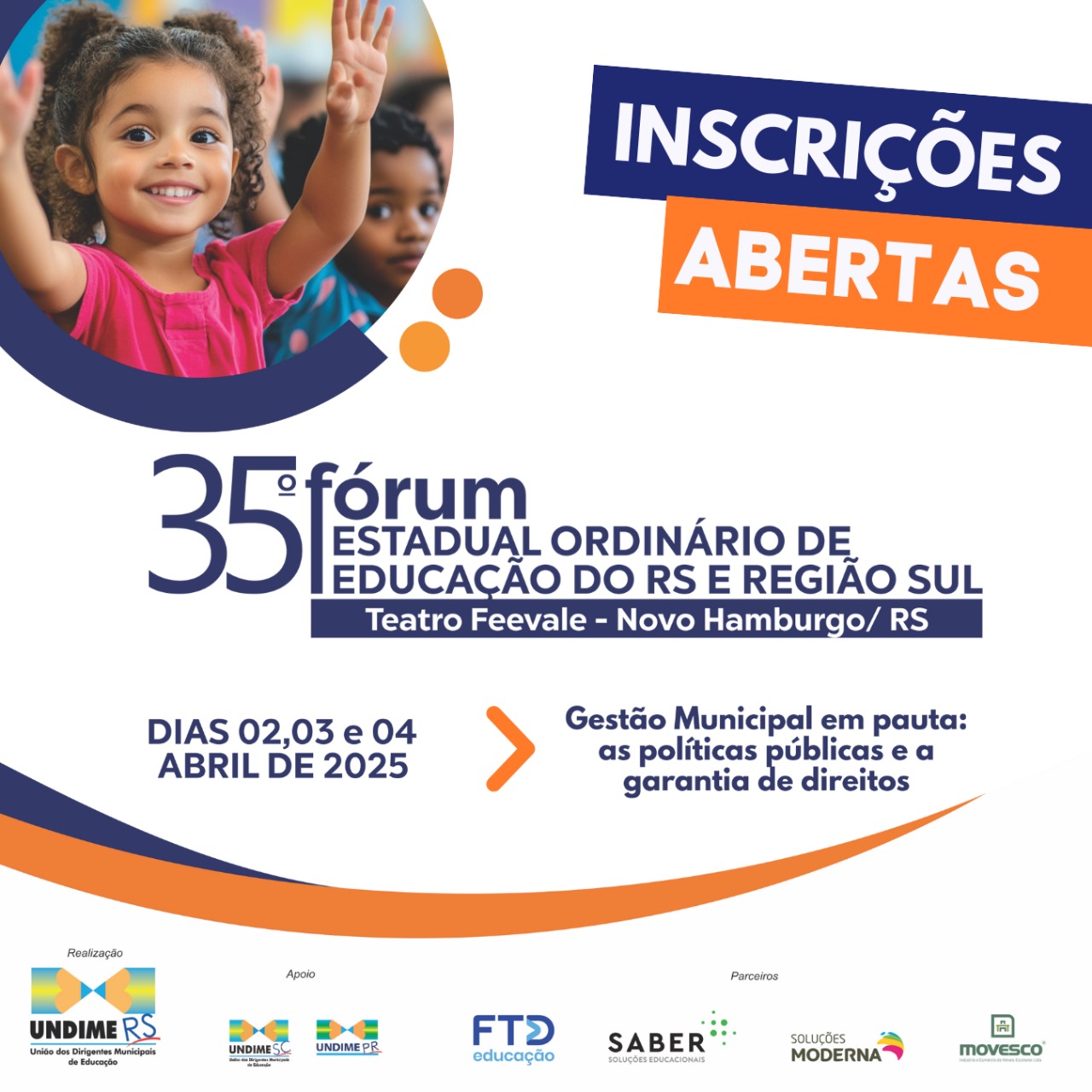 A partir da temática “Gestão Municipal em pauta: as políticas públicas e a garantia de direitos”, a Undime Rio Grande do Sul realizará a 35ª edição do Fórum Estadual Ordinário de Educação do Rio Grande do Sul e Região Sul, nos dias 2, 3 e 4 de abril, em Novo Hamburgo/RS.