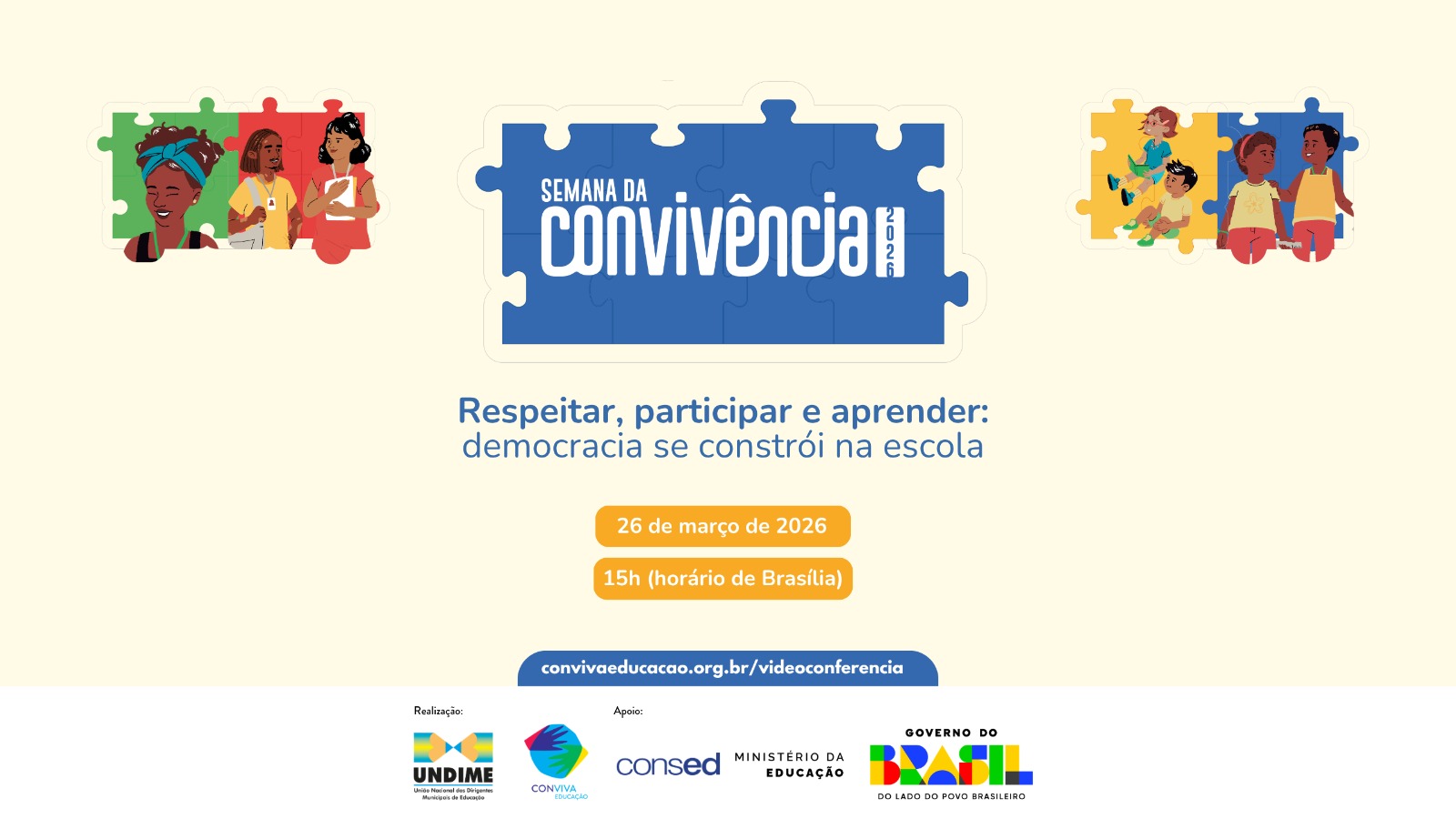 Nesta quinta-feira, 26 de março, às 15h (horário de Brasília), será realizado o webinário de lançamento da Semana Nacional da Convivência Escolar 2026, que neste ano traz como tema “Respeitar, participar e aprender: democracia se constrói na escola!”.